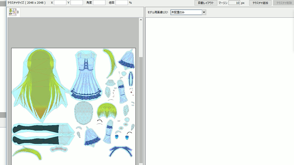 メニューのモデリングからテクスチャを選択し、テクスチャアトラス編集を実行してフェイスリグ用のテクスチャを書き出します。